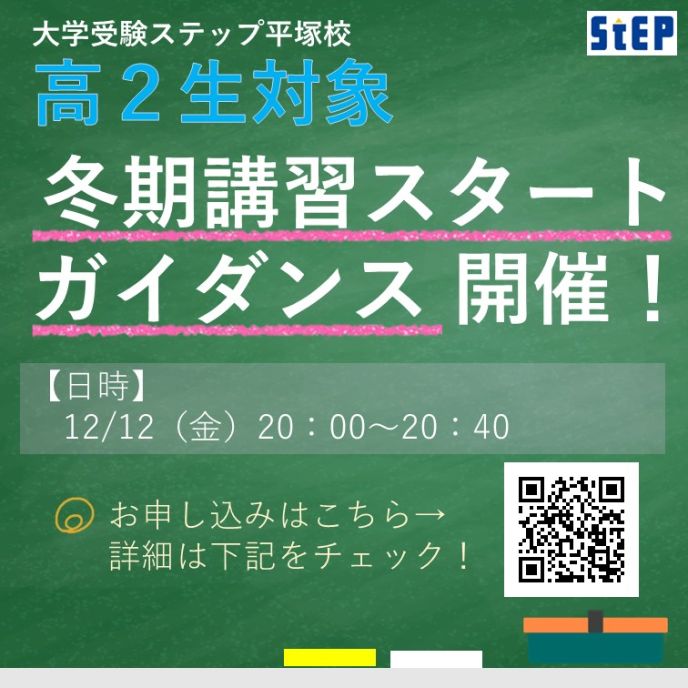 高2生を対象に、今後の勉強の仕方についてガイダンスを実施します。冬期から受験勉強をスタートしようと考えている方は、ぜひご参加ください。お申込みは、上記の案内のQRコードから回答、または大学受験STEP平塚校(TEL 0463-24-6377)にご連絡ください。