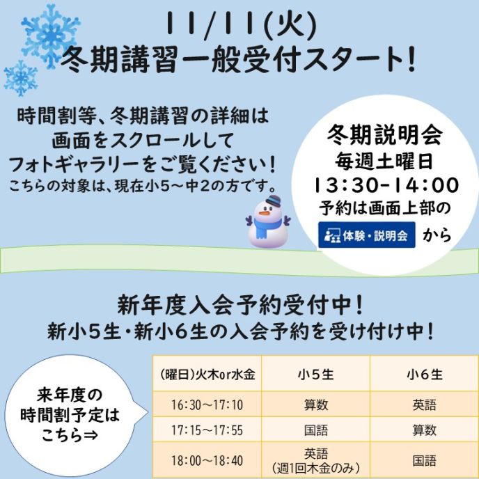 11/11(火)から、冬期講習の一般受付を開始いたします。