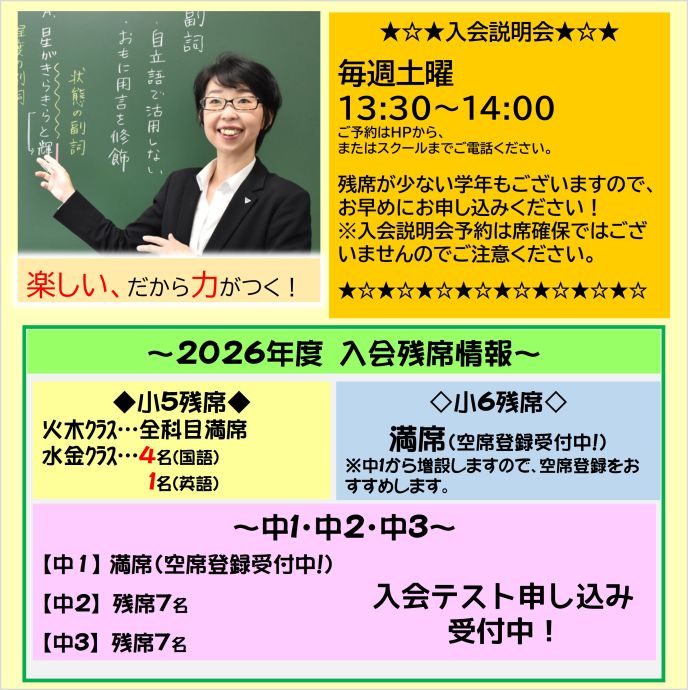 中学生は入会テストがございますので、入会希望の方は入会テスト申込にいらしてください。