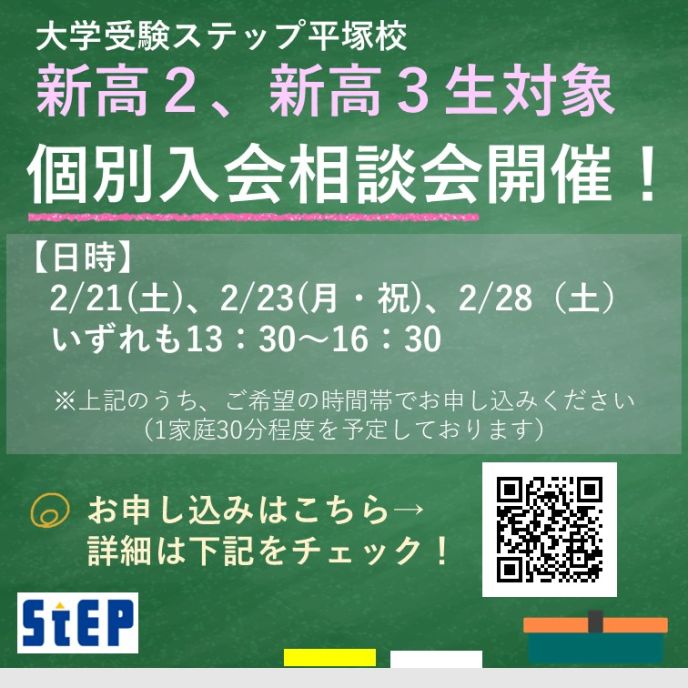 現在塾生ではない方に向けて、新学年に向けた勉強の進め方や、K-STEPのシステムについて平塚校のスタッフが個別でご説明いたします。時間は13:30~16:30(1家庭30分程度)を予定しております。進路相談等も受け付けますので、是非お申し込みください!お申し込みは、トップ画像のQRコードを読み込んでお申し込みいただくか、校舎までお問い合わせください。