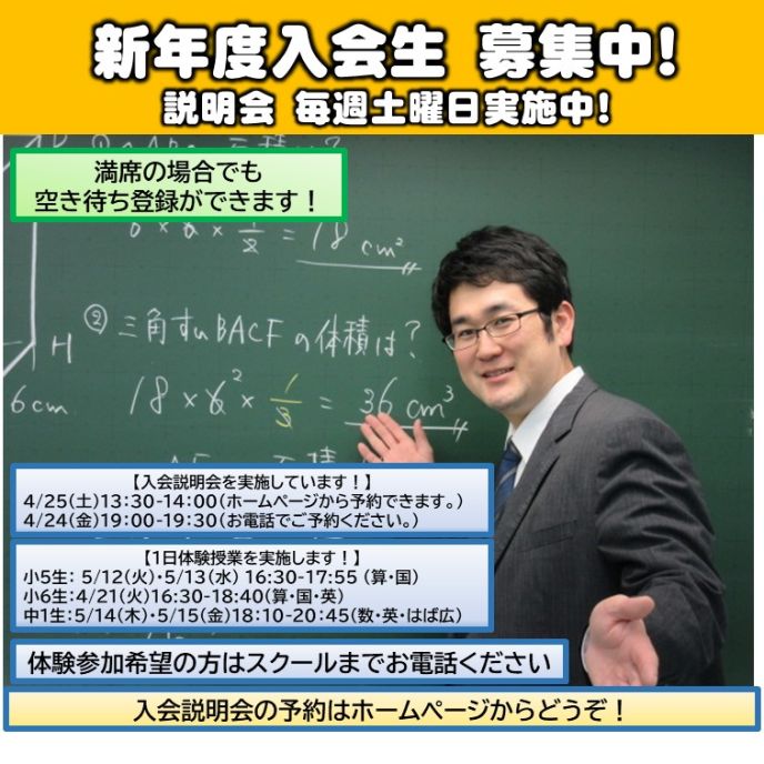 4/25(土) 13:30-14:00 全学年対象(ホームページから予約できます)