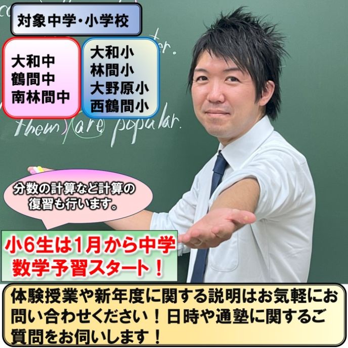 来年の1月から小6生は中学数学の予習を開始します。約2か月間かけて、中1数学の最初の単元を勉強します。毎年予習をする中で「分数の計算が苦手!通分のやり方を忘れた。」という声が上がります。鶴間スクールでは予習はもちろん、分数の計算など復習内容も同時に行います。一緒に早めの準備を行いましょう!