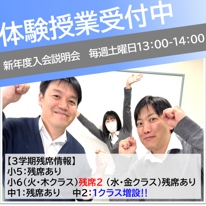 2学期までは現中2生は満席となっていましたが、1月よりクラスを1つ増やして授業を行います。ご興味のある方は、是非スクールまでご連絡ください。