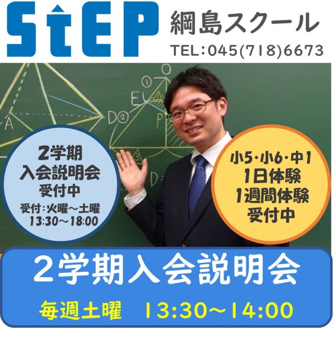 体験授業のお申し込みは,綱島スクールまでお電話(045-718-6673)にてご予約ください。(受付:火曜~土曜 13:30~18:00)