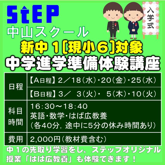 ステップの小6生は,1月より算数が数学となり、中1数学の「正負の数」の先取り学習がスタートします。中学生活のスタートダッシュを決めたい生徒はぜひ1/9(金)からの体験授業に参加してみませんか。体験費は1,000円(税込)です。