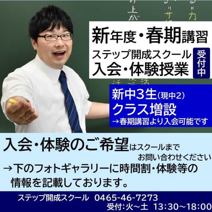・新中3生は春期講習より1クラス増設いたします。残席は18です。