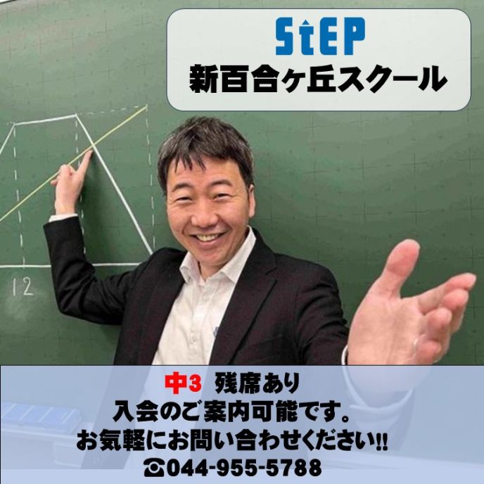 ステップ新百合ヶ丘スクールは、新百合ヶ丘駅周辺の多くの小中学校から生徒が通っています。最終目標は高校受験ですが、勉強の習慣をつけ、楽しく前向きに勉強することも目標としています。新中3の方のみ空きがあります!ご連絡頂ければ、4月からの入塾が可能です。入塾希望の方はスクールまでご連絡ください。