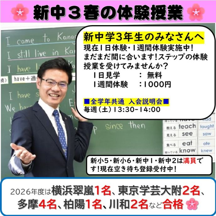 新中3はクラスの増設によりまだお申し込みができます!