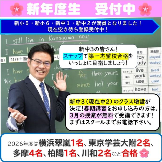 現在中学2年生で、ステップをご検討中の方に朗報です!春期講習よりクラスを1クラス増設することが決定しました。現在空き待ち登録をされていたみなさん、大変お待たせしました。順番にご連絡を差し上げます。定員は20名となります。ステップでいっしょに第一志望の高校を目指してみませんか!?まずはスクールまでお電話ください。
