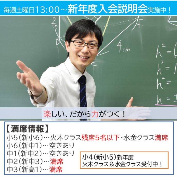 小5…火木クラス残席5名以下、水金クラス残席満席(空席連絡登録受付中)