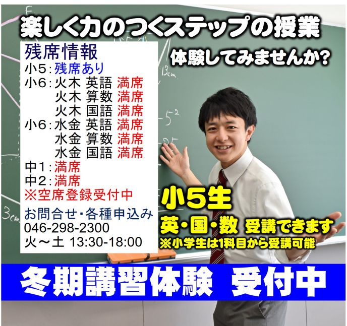 現在満席の小6、中1、中2では空席登録を受け付けています。各学年空席登録が10名程度いらっしゃいます。
