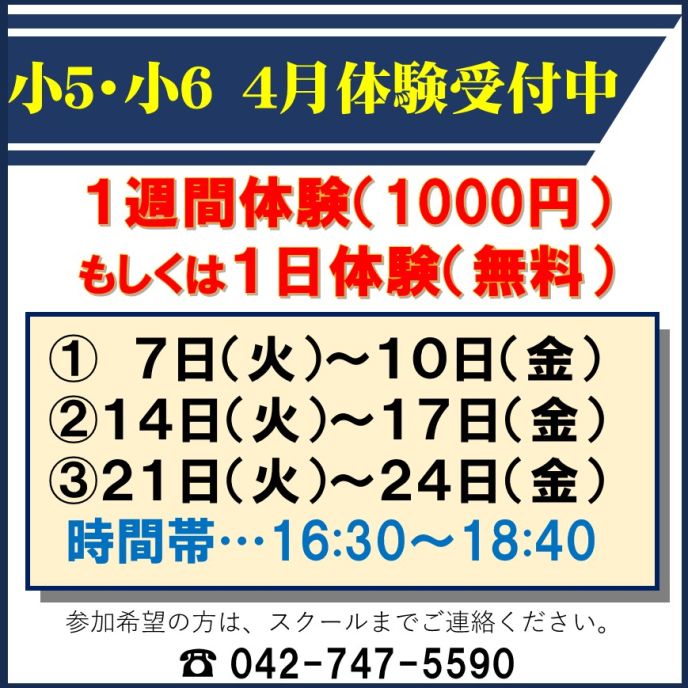小5・小6・中2・中3生を対象に1日体験(無料)、1週間体験(1000円)を受付中です。