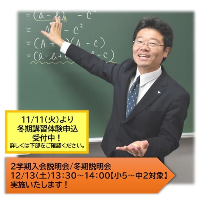 以下の日程で2学期入会説明会/冬期説明会を実施いたします!現時点で満席の学年もございます。入会をご検討中の方はぜひお早めにご参加ください。