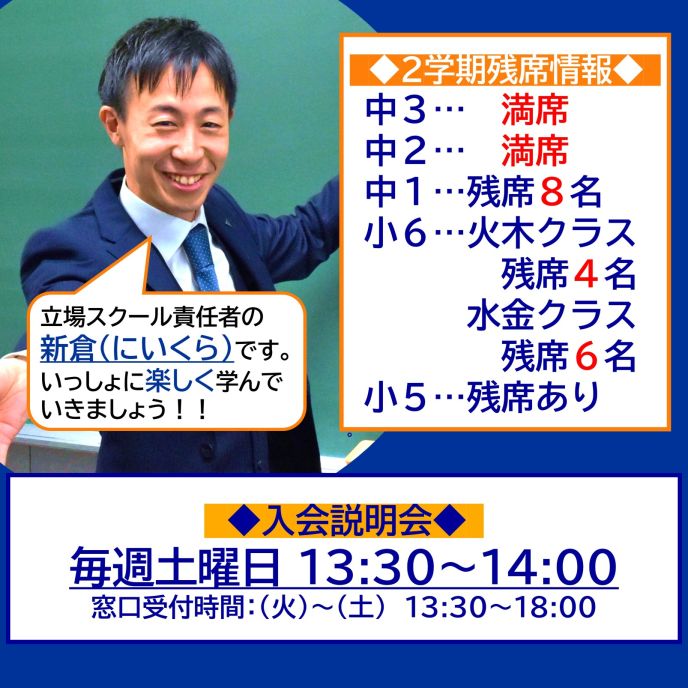毎週土曜日に入会説明会を13:30~14:00に実施しています。ステップについて興味がある方、どのような塾なのか知りたい方、お気軽にご参加ください。入塾についてのご相談も随時受け付けております。参加をご希望の方はHP上からご予約ください。