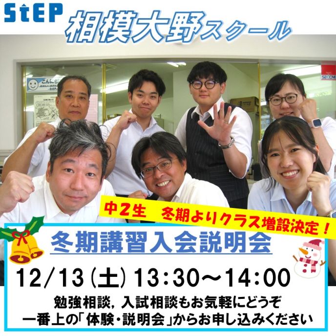 中2生を冬期講習から1クラス増設いたします。ステップへご入会をご検討の方はぜひ体験にいらしてください。