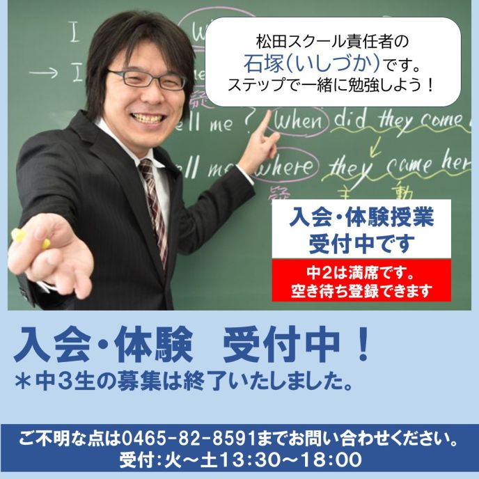 みなさん、こんにちは。松田スクール責任者の石塚です。STEPでは「楽しい、だから力がつく!」をモットーに毎日メリハリのある授業を目指して、生徒も教師も頑張っています。学校の成績をあげたいという人はもちろん、最近少し勉強がわからないと感じる人、もっと難しい問題にチャレンジしたい人、部活との両立を考えている人などぜひ、一度STEPの体験授業に参加してみませんか? 一緒に脳みそを鍛えていきましょう!