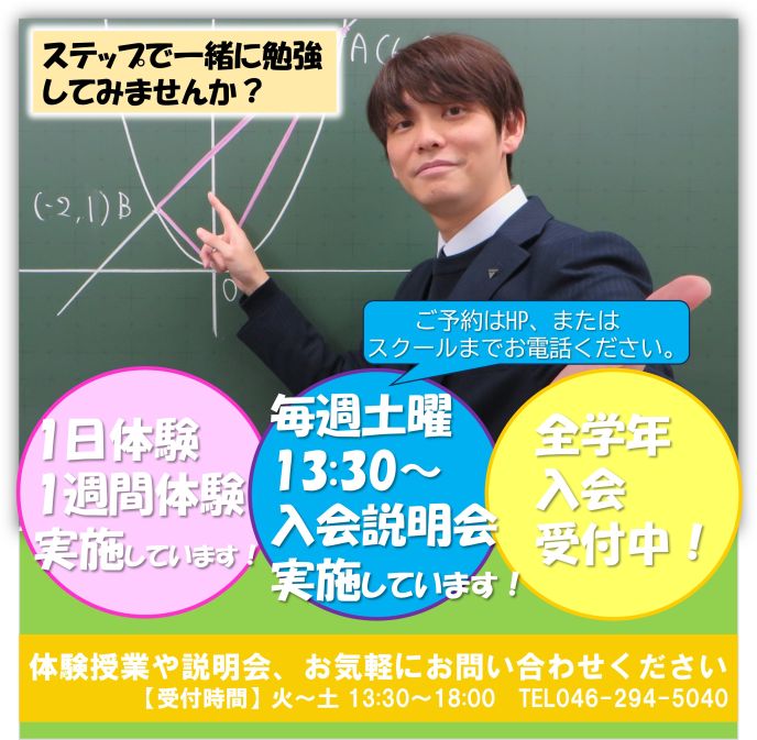 ☆「楽しくて力がつく」。ステップはそんな塾です。部活や委員会、習い事などに忙しい皆さんを勉強面で応援したいと思っています。ぜひステップで一緒に勉強しましょう!