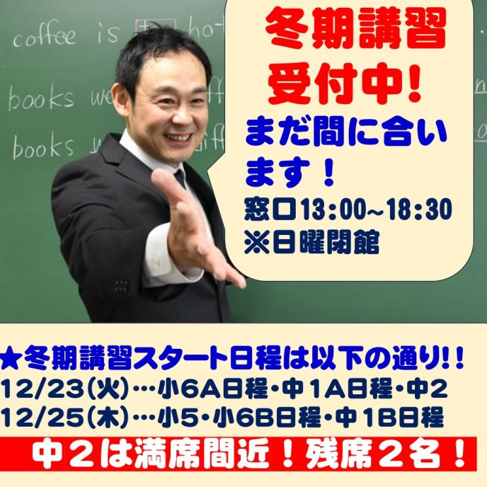 冬期講習の体験や入塾の相談、その他、お問い合わせはスクールまでお気軽にお電話ください!