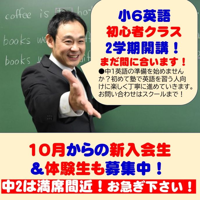 今の中学生の英語の教科書は親御さんの世代の教科書と比べ驚くほど難しくなり、英語で苦戦している中学生が大勢います。そこで、秋から「初心者英語クラス」を開講しました!