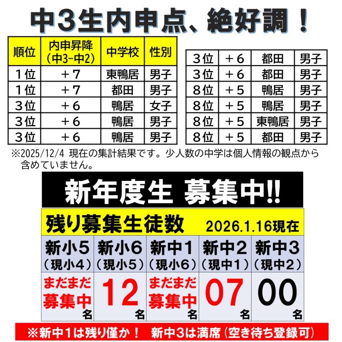 ・新小5(現小4):火木クラス…残り15名、水金クラス…残り12名