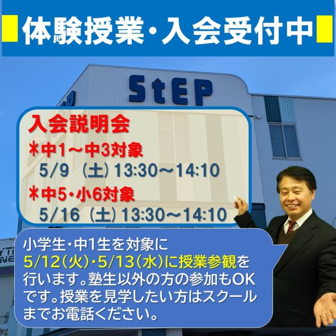 塾生以外の方もご参加できます。ステップの授業を見学してみたいという方はスクールまでお電話ください。