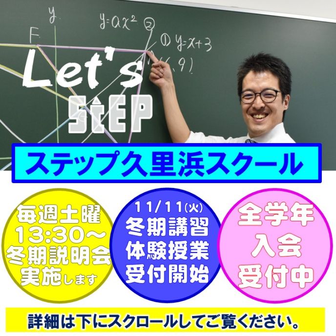 毎週土曜13:30~(14:00終了予定)にて【冬期講習受講相談会】を実施します。事前予約フォームから申込できますが、当日直接来ていただいても構いません。ステップでの入会や冬期講習の受講について、また、塾探し・塾通いを検討している方はご参加ください。