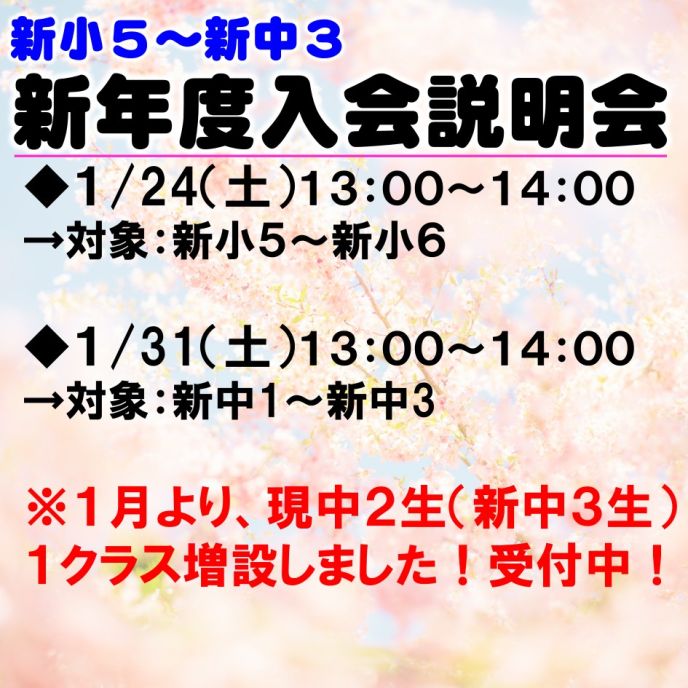◎1/31(土) 入会説明会 新中1~新中3対象(60分)