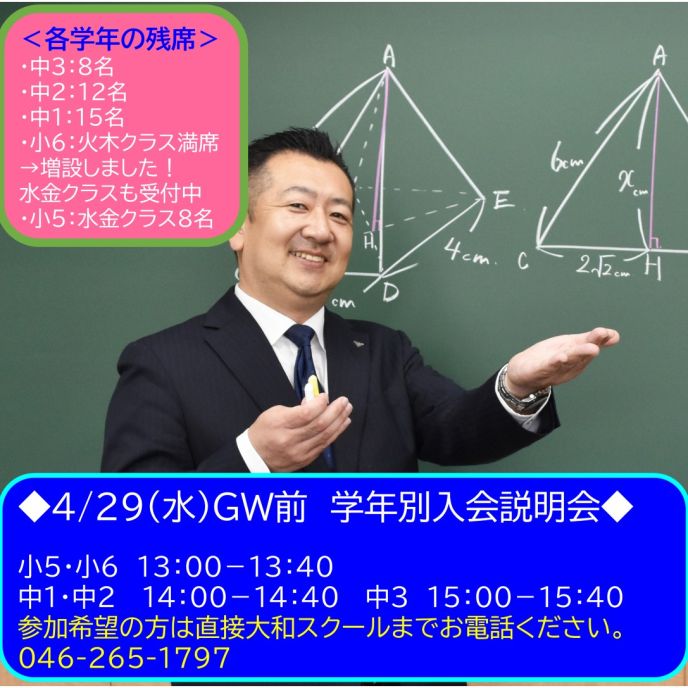 ※学年別入会説明会に参加希望の方は必ず大和スクールまでお電話にてご連絡ください。