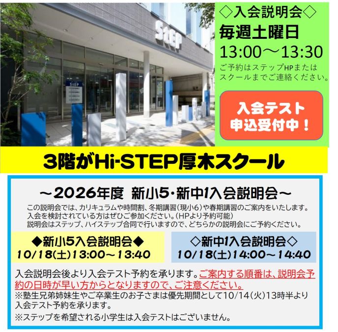 上記の説明会後より新小5(現小4)の入会テスト予約を受付いたします。予約の順番は説明会予約をされた方からご案内していきますのでお早めにご予約ください。