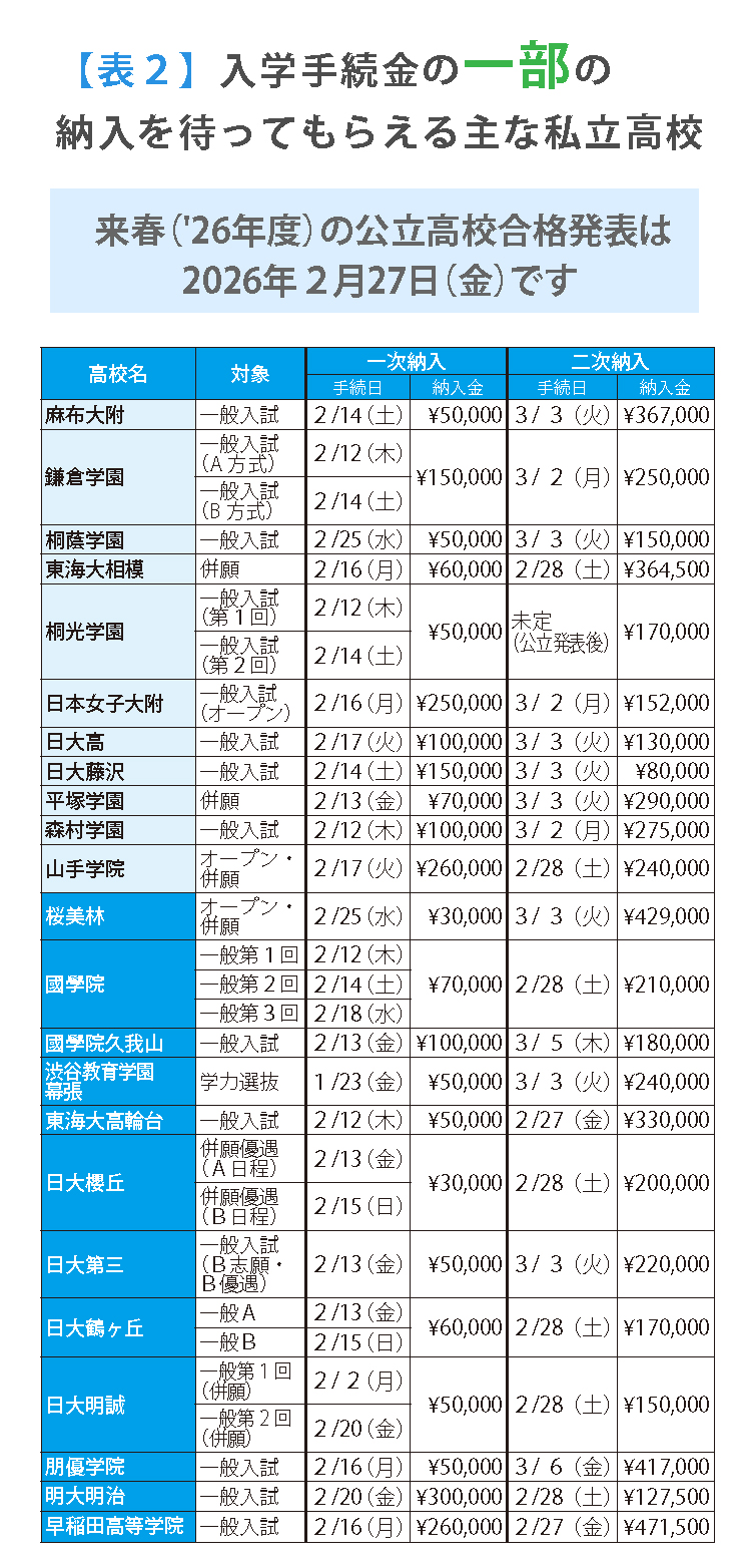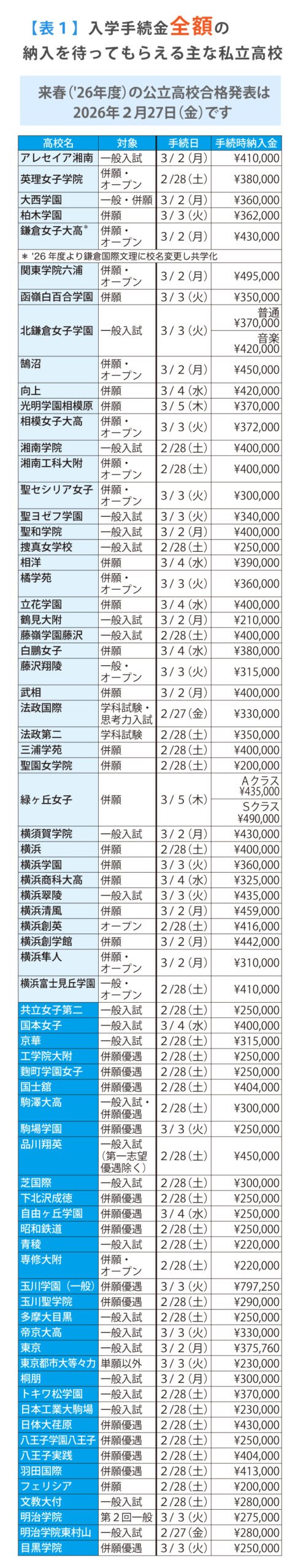 手続金全額を待ってもらえる私立高校(【表1】)では、公立高校合格発表翌日の2月28日(土)が手続締切日となっているケースが多くあります。
