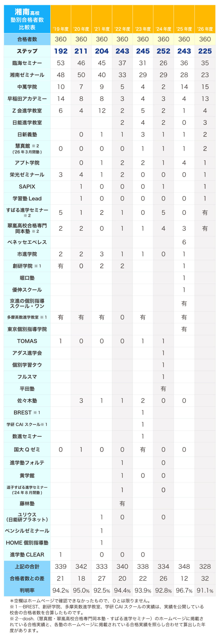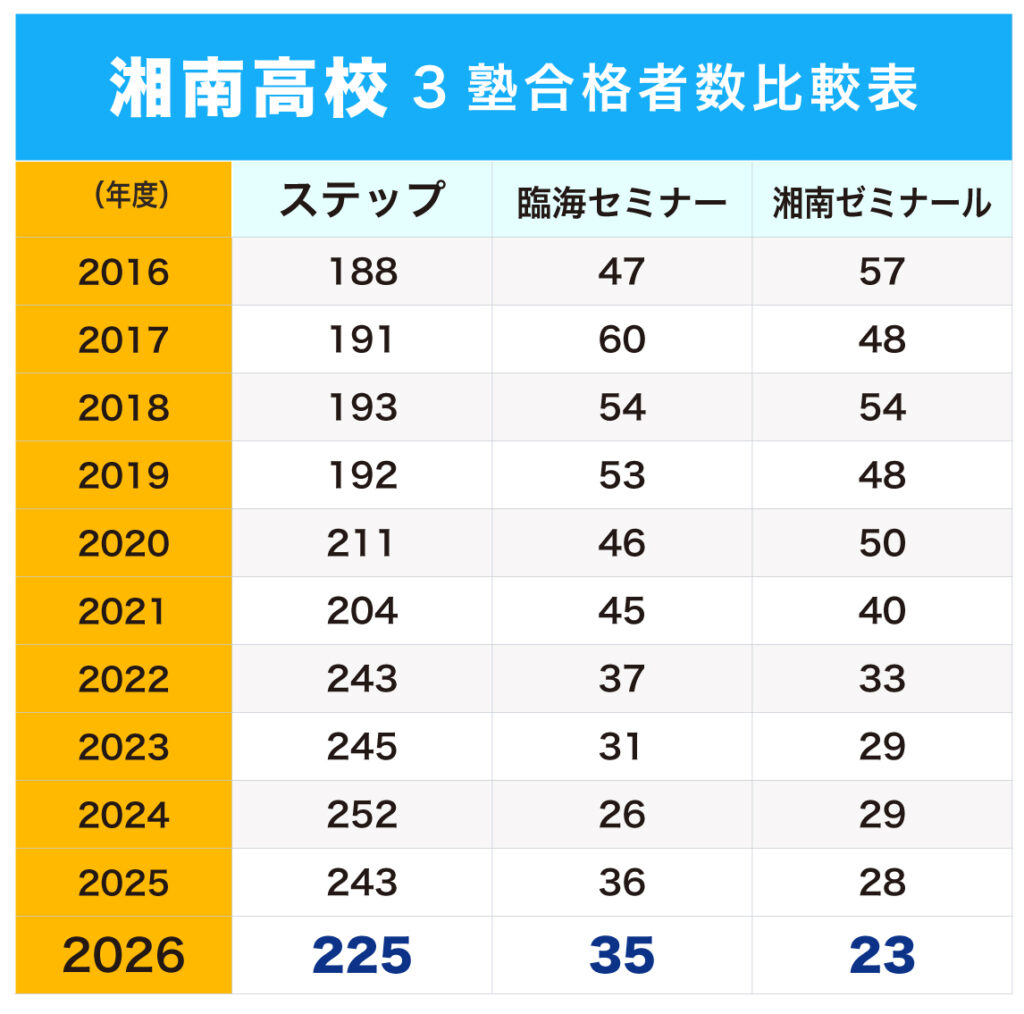 2025年度入試では、湘南高校の定員359名(実際の合格者は360名)に対し、ステップからの合格者は243名。