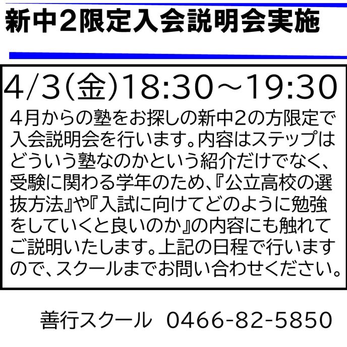 ・4/3(金)新中2限定入会説明会
