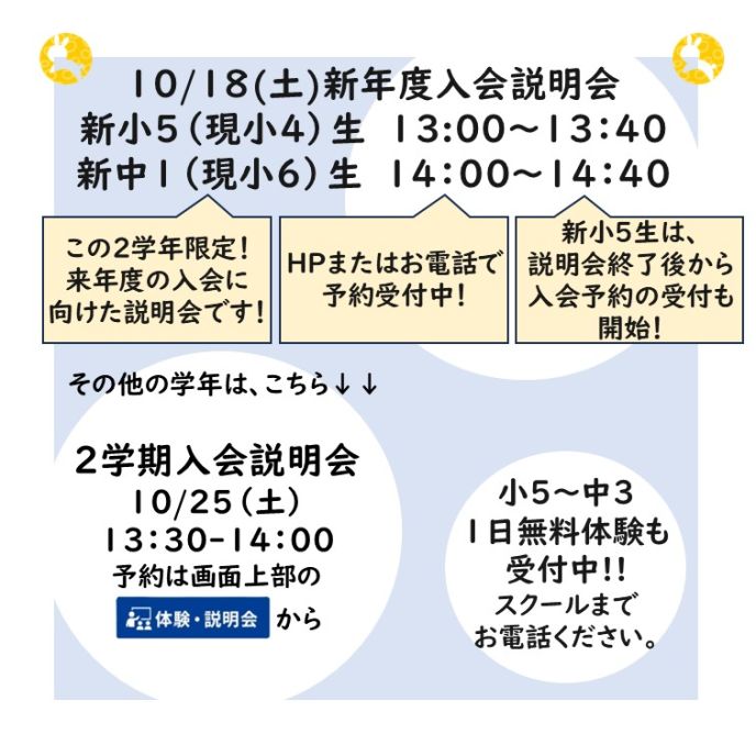 ※10/11(土)と10/18(土)は、2学期入会説明会は実施いたしません。