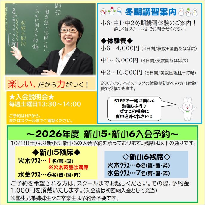 ステップ厚木スクールの冬期講習は小6・中1・中2で体験のご案内が可能です。