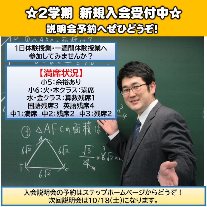 ▼ステップの新年度の入会受付は1月からとなっていますが、新小5(現小4)生の入会予約を10/18(土)からお受けいたします。