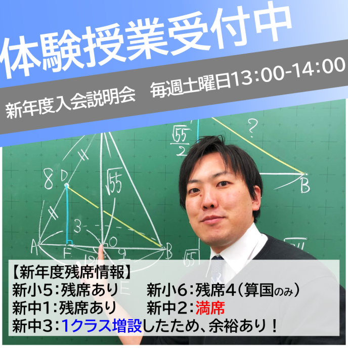 新小6…(火・木クラス)算数国語は残席3,(水・金クラス)残席あり