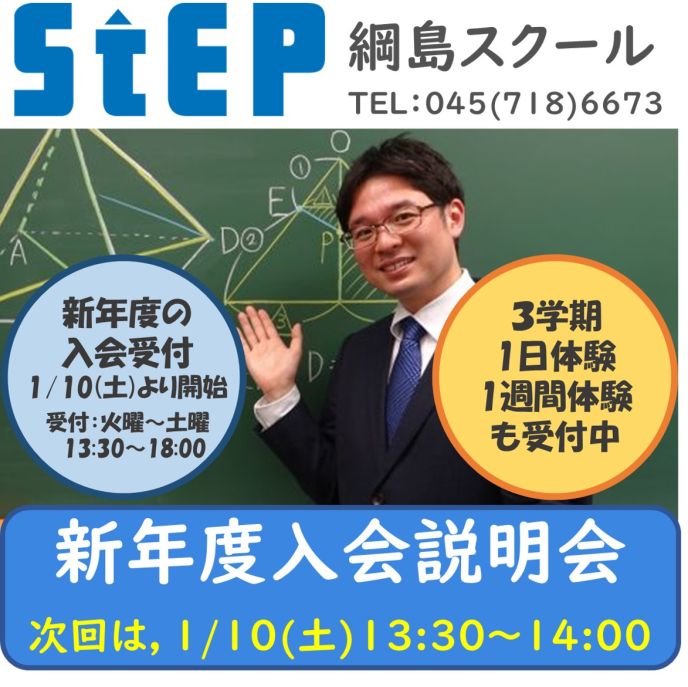 体験授業のお申し込みは,綱島スクールまでお電話(045-718-6673)にてご予約ください。(受付:火曜~土曜 13:30~18:00)
