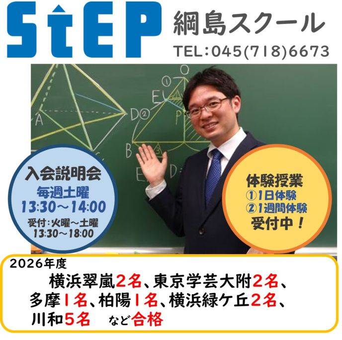 体験をご希望の場合は,綱島スクール(045-718-6673)までお電話ください。上記日程以外での体験をご希望の場合もご連絡ください。