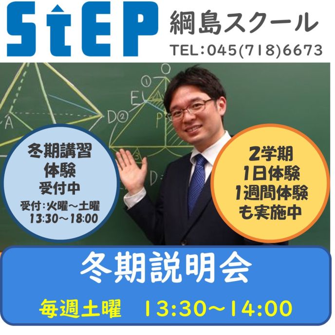 冬期講習説明会となります。ステップのカリキュラムや授業の進め方についてもご説明いたします。お気軽にご参加下さい!
