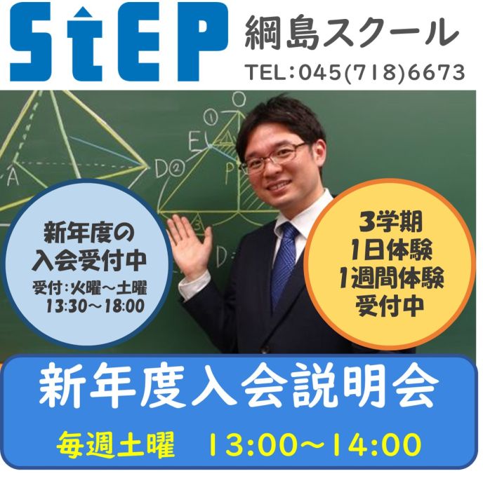 体験授業のお申し込みは,綱島スクールまでお電話(045-718-6673)にてご予約ください。(受付:火曜~土曜 13:30~18:00)