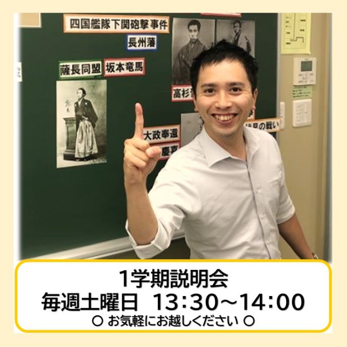 毎週土曜13:30~(14:00終了予定)、【1学期説明会】を実施します。事前予約フォームから申込できますが、当日直接来ていただいても構いません。