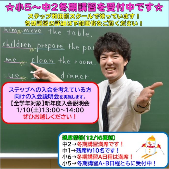 小5~中2の冬期講習の申込を受け付けます。定員がありますのでお早めにお申し込みください。