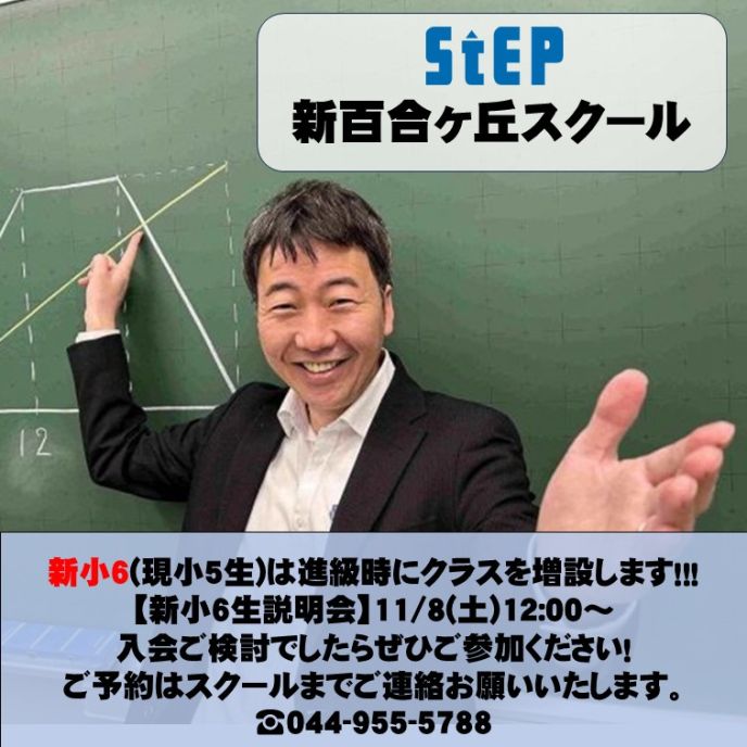 ステップ新百合ヶ丘スクールは、新百合ヶ丘駅周辺の多くの小中学校から生徒が通っています。最終目標は高校受験ですが、勉強の習慣をつけ、楽しく前向きに勉強することも目標としています。全学年満席ですぐには入会ができない状況ですが、来年度からの入塾はできる可能性があります。ステップを検討している方はお早めにご連絡ください。