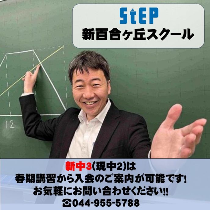 ステップ新百合ヶ丘スクールは、新百合ヶ丘駅周辺の多くの小中学校から生徒が通っています。最終目標は高校受験ですが、勉強の習慣をつけ、楽しく前向きに勉強することも目標としています。現中2の方のみ空きがあります!ご連絡頂ければ、3月からの入塾が可能です。入塾希望の方はスクールまでご連絡ください。