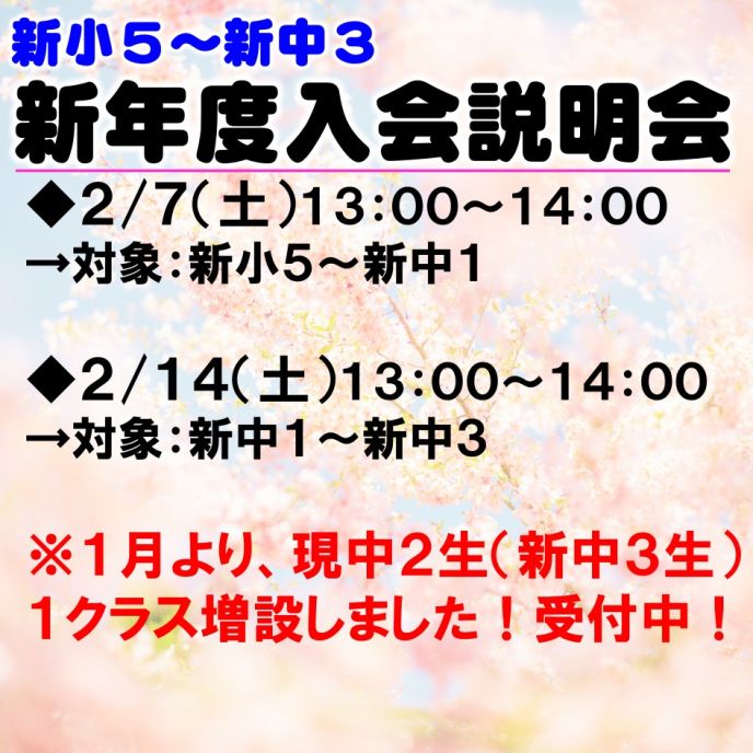 ◎2/14(土) 入会説明会 新中1~新中3対象(60分)
