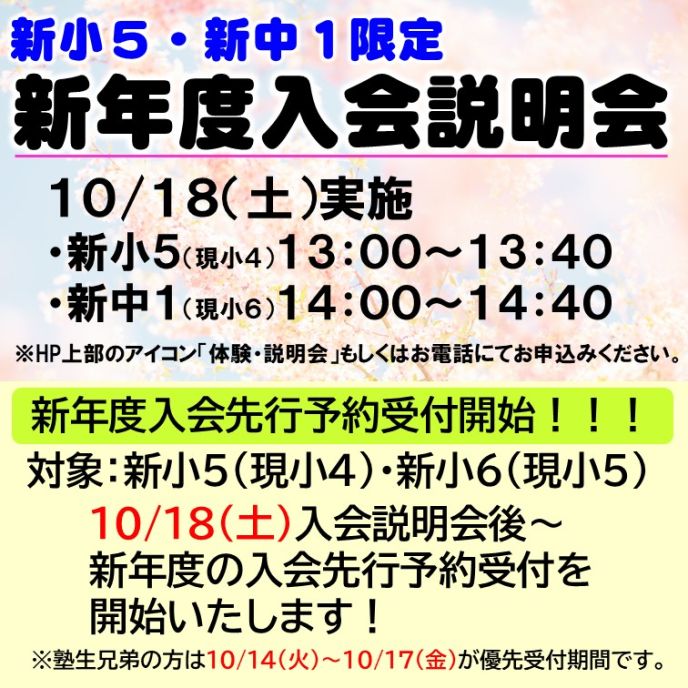 10/18(土)に新年度の新小5・新中1を対象とした説明会を実施します。