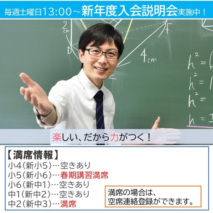 ※中2、小5(水金クラス)は現在満席です。空席連絡登録ができますので、スクールまでお問い合わせください。