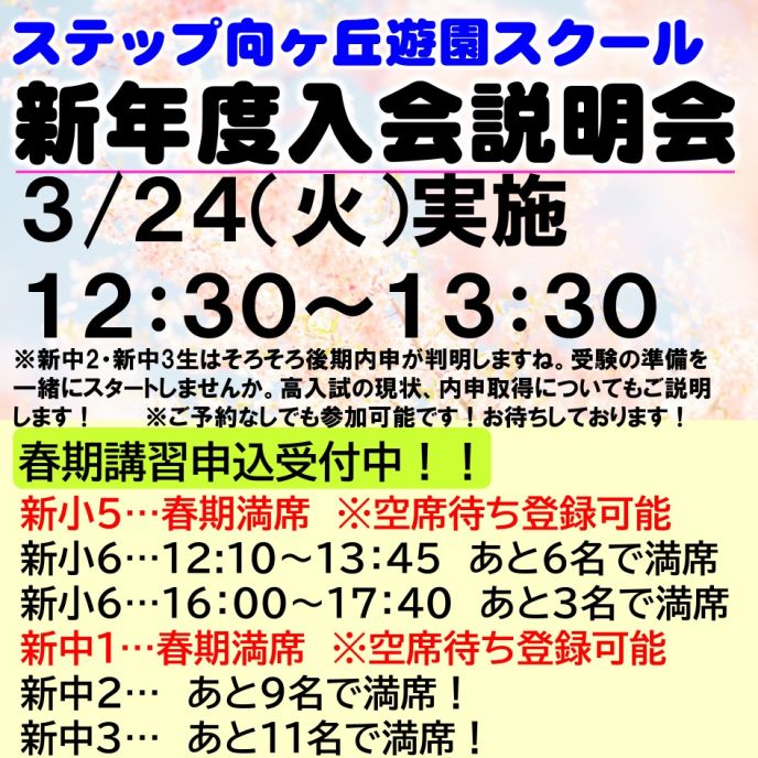 新小5~新中3対象新年度入会説明会