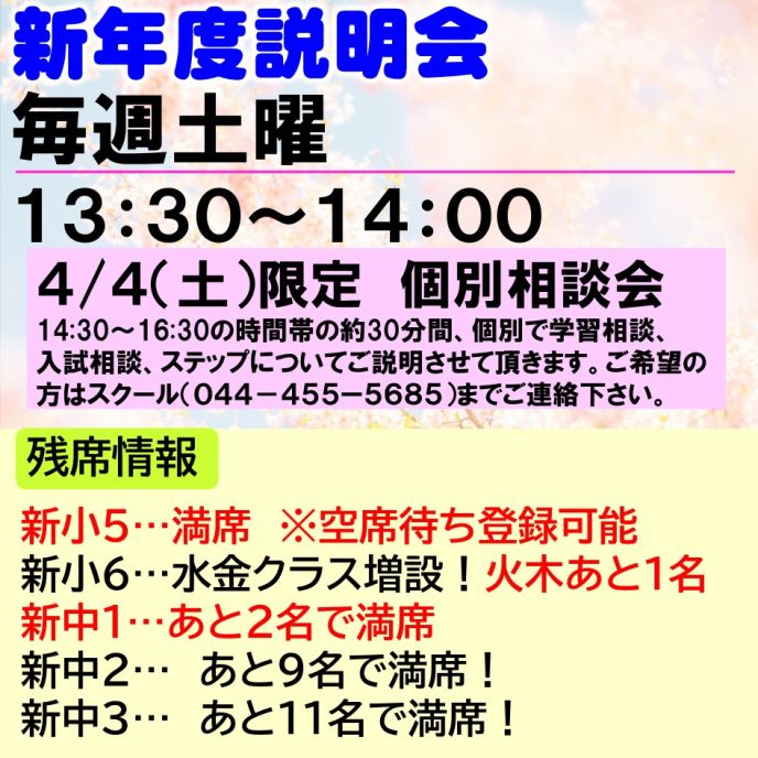 新小6…火木クラス算数あと1名で満席。水金クラスは4月から開講。水金はゆとりあります