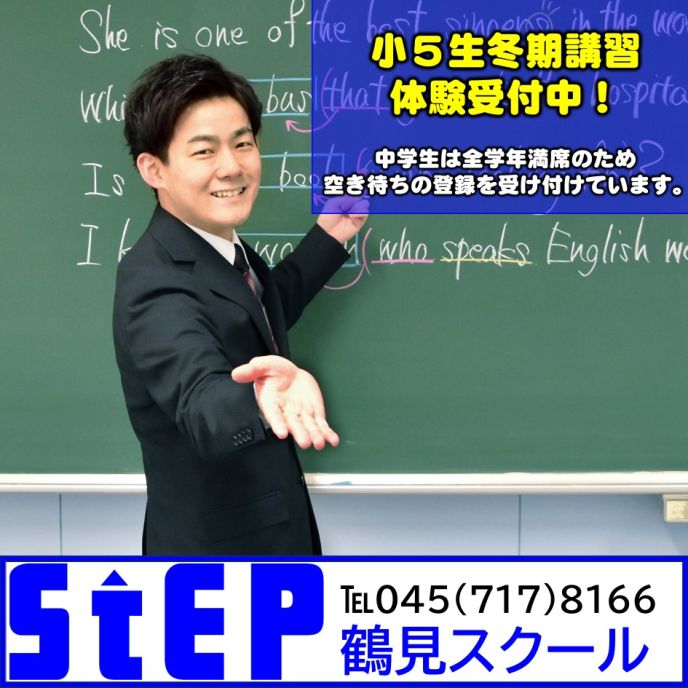 現在,冬期講習の体験申し込みをスクール窓口にて受け付けています。現在鶴見スクールでは,中学生及び小6が満席のため,小5生のみを対象としています。また,鶴見スクールにおいては小5はA日程での体験受付としています。下部フォトギャラリーにて,詳細な時間割を掲載しておりますのでご確認ください。